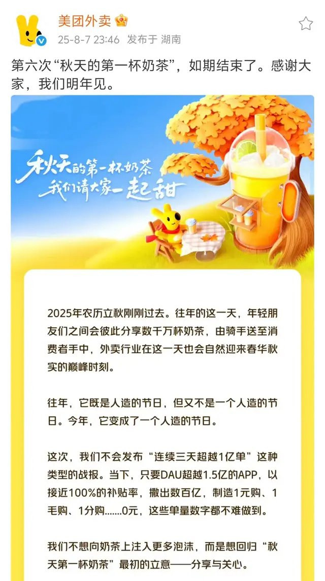 “秋奶”的梗火了六年,从社交货币演化为立秋大促IP,堪称外卖奶茶界的双11。