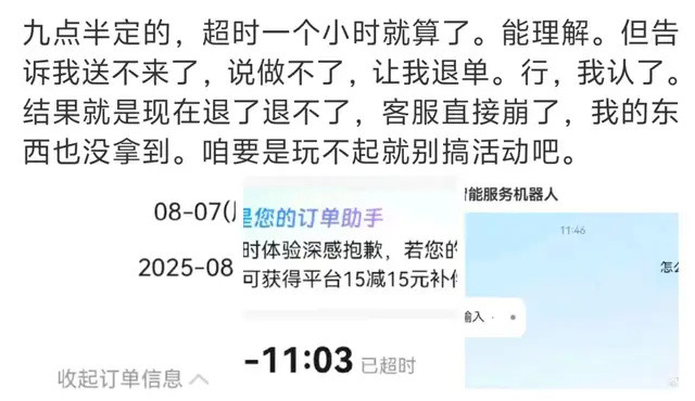 无形之中,消费者的情绪阈值抬高,在立秋专属奶茶消费日,平台为了冲峰值,仍一味地狂撒免单优惠,爆单导致的订单积压、送餐慢、退款难、系统崩溃的体验降级,反而放大对“秋奶”的负面情绪。笔者询问了身边朋友,上述问题比比皆是,短则超时一个小时,还有的上午点的单下午还在备货、取餐。