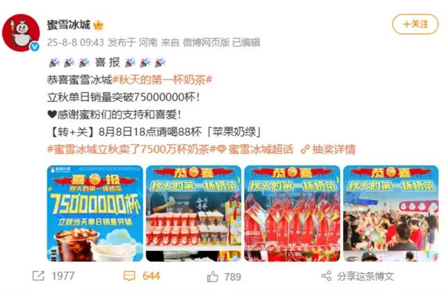 事实上,去年美团就已经有所尝试,2024年“秋奶”期间,蜜雪冰城首发新品茉莉奶绿,自发布后稳居品牌销量前五名。今年范围扩大,充分验证了新品与补贴叠加的成效,更利于新品快速打开市场。我们可以合理推测,明年的立秋奶茶大战,上新应该会成为全行业标配动作。